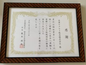 高砂市功労・善行者表彰式にて兵庫ヤクルトに頌志賞を贈呈いただきました
