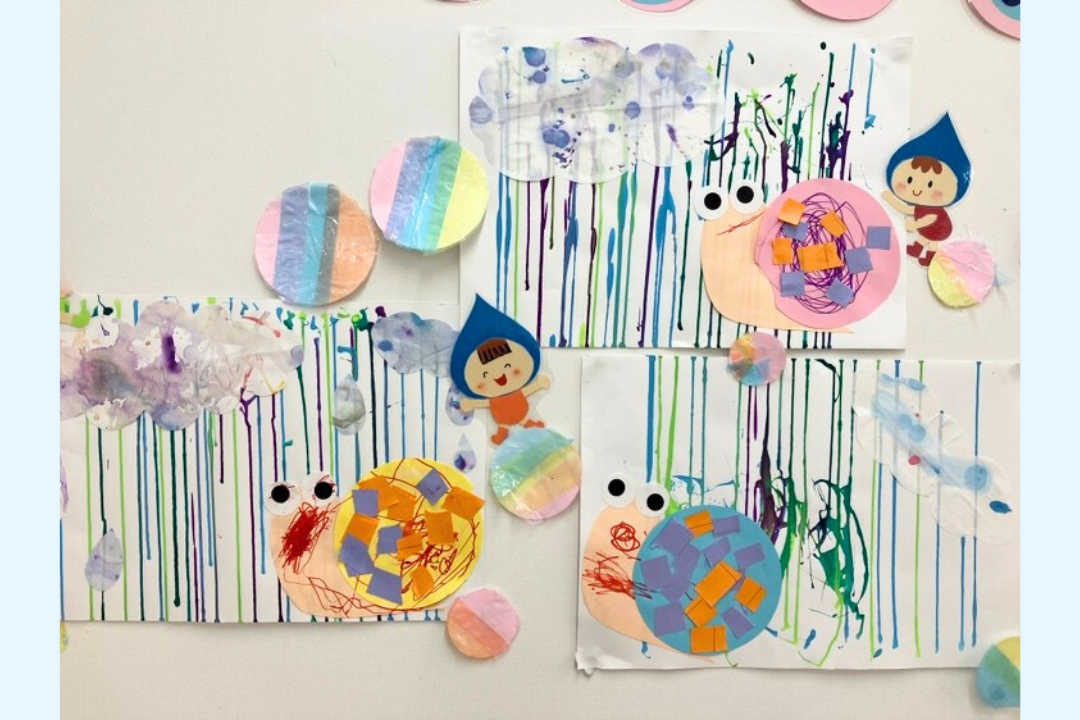 「雨」の製作では、子どもたちが自分で好きな色を選びました。「つゆ」の製作時に使用したスポイトが子どもたちに好評で、スポイトから絵の具が流れる様子を子どもたちは不思議そうに見つめて楽しんでいました。