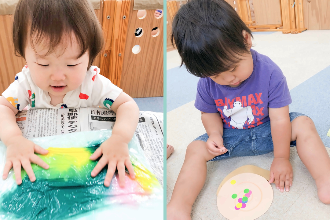 ヤクルトキッズスクール舞子かもめ保育園では、ひよこ組(0~1歳児)とうさぎ組(2歳児)に分かれて、それぞれ年齢に合わせた内容で製作活動を行いました。