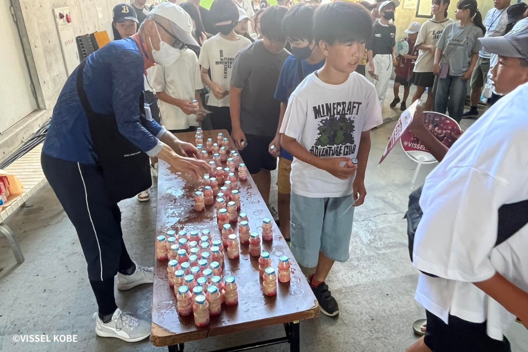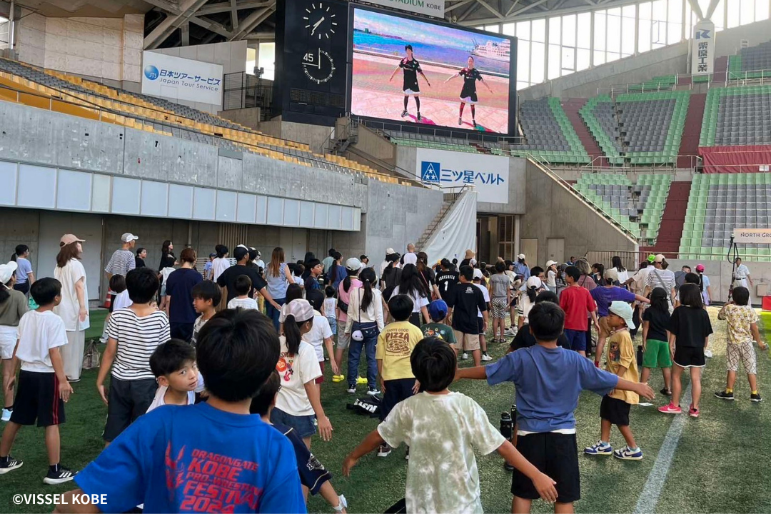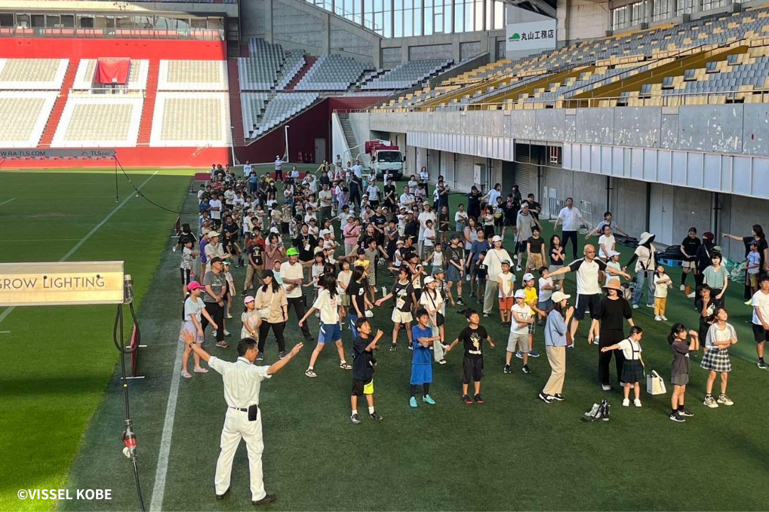 ヴィッセル神戸では、2020年から毎年夏の恒例行事として、近隣の皆さまの健康促進を目的に、ノエビアスタジアム神戸のピッチサイド(北側エリア)を活用し、ラジオ体操を実施されています。