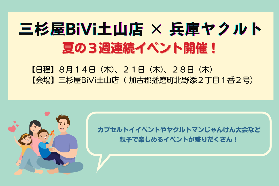 兵庫ヤクルトは、7月24日にリニューアルオープンした三杉屋BiVi土山店にて、地域の皆さまに楽しんでいただけるイベントを3週連続で開催いたします。