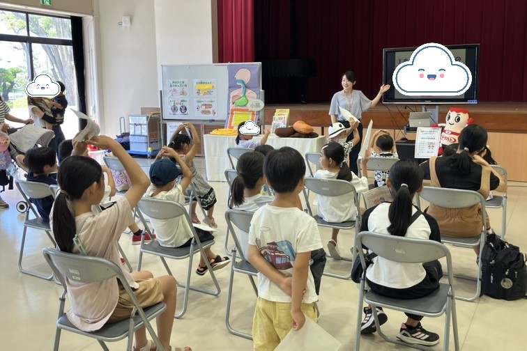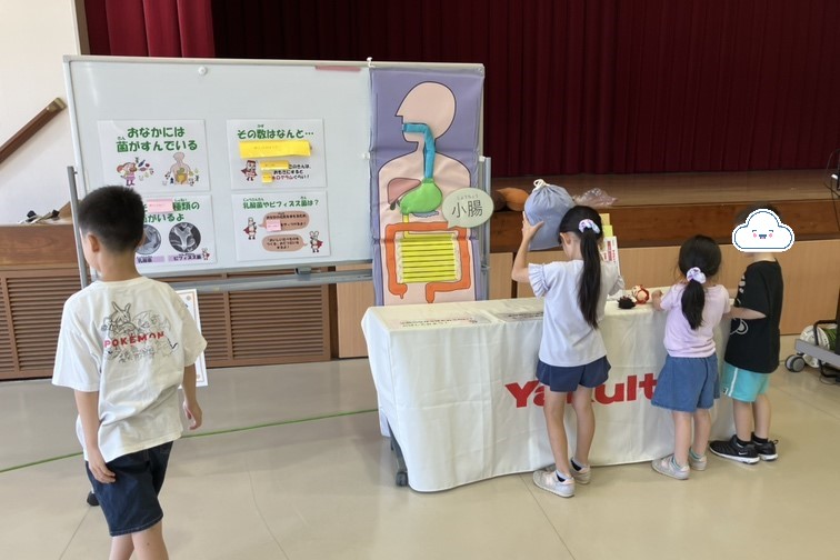 今回で第36回を迎える「播磨町学校給食展」では、日頃の学校における給食や食育に関するパネル展示や発酵食品をテーマとしたイベントが行われました。兵庫ヤクルトでは、お子さまに向けて「ミニおなか元気教室」を実施し、腸内細菌に関する展示も行いました。元気なうんちについてクイズをしたり、発酵食品のお話もさせていただきました。