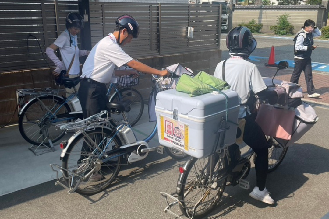 時のまち明石ステーションを拠点に活動している、兵庫ヤクルトのコミュニティナースとヤクルトレディに同行していただきました。コミュニティナースはヤクルトレディのお客さまにお会いすることが多いため、実際にお届け車両の自転車にも乗っていただき、一緒に地域のお客さまのところへ向かいました。渡邉さんの自己紹介のお話からは、その誠実さや、このような体験に自ら参加しようとする意欲や勇気が伝わり、地域の皆さまも温かい笑顔と声援で迎えてくださいました。