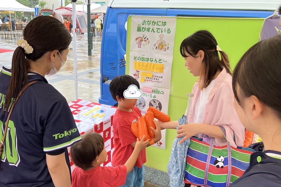 午前中はあいにくの雨模様でしたが、午後には天候も徐々に回復し、たくさんのご家族連れの方を中心に来場されていました。防災・福祉・SDGsに関するさまざまな体験と学びのコーナーが設けられ、兵庫ヤクルトでは、こども体験ブースの1つとして、「腸(チョウ)元気クイズ」を実施し、消化管模型の展示や小腸の長さ・腸内細菌の重さの体験、おなか元気の秘密を学ぶクイズを行いました。