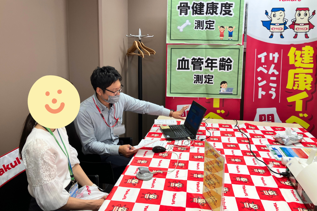 社員の皆さまの健康促進につながるイベントを実施したいとのお声がけをいただき、今回の開催が実現しました。当日は、血管年齢・骨健康度の測定会やヤクルト商品の試飲会・販売会を行いました。