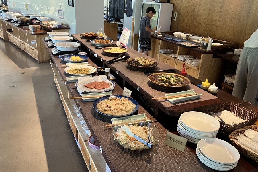 味彩苑は、地産地消と手作りにこだわるバイキングレストランです。名物のだし巻き卵や地元産米「きぬむすめ」の料理など、旬の食材を活かした和洋惣菜が豊富に並びます。