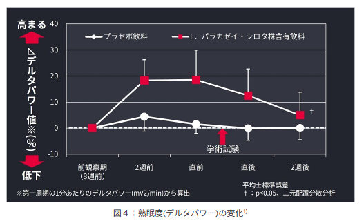 また、プラセボ群と比べて、L.パラカゼイ・シロタ株飲用群では脳波の解析で深い睡眠を示すデルタパワーが高まり、熟眠度が向上したことが分かりました(図4)。