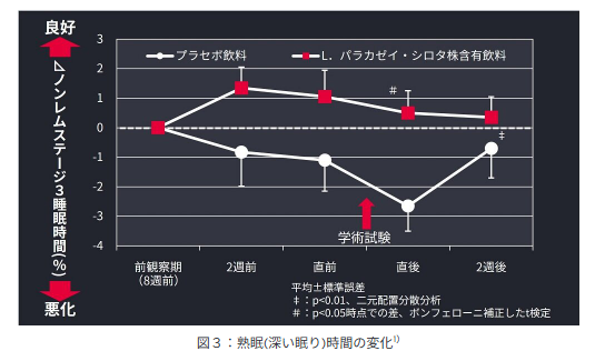 客観的な評価として、睡眠中の脳波を測定し、最も深く眠れているノンレムステージ3の熟眠時間を解析すると、プラセボ群は試験が近づくにつれ熟眠時間が悪化しますが、L.パラカゼイ・シロタ株飲用群では良好な状態が保たれていました(図3)。