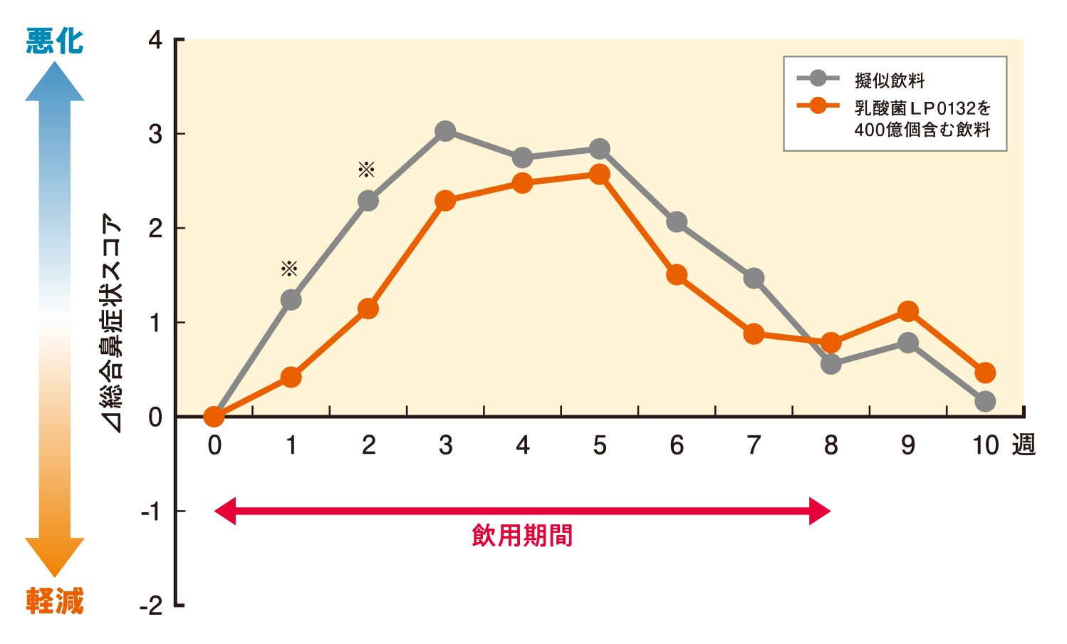 花粉による不快感を有する成人93名を2群に分け、被験群には「乳酸菌LP0132を400億個含む乳酸菌発酵果汁飲料」(生菌を含まない)を、対照群には「擬似飲料」(味や外見は同じで、LP0132を含まないもの)を1日1個(125ml)、8週間飲用してもらいました。