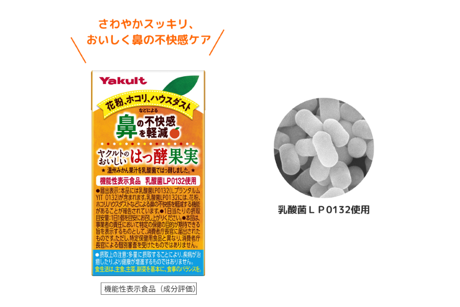 花粉、ホコリ、ハウスダストなどによる鼻の不快感を軽減する機能があることが報告されている「乳酸菌LP0132」を関与成分とする機能性表示食品です。