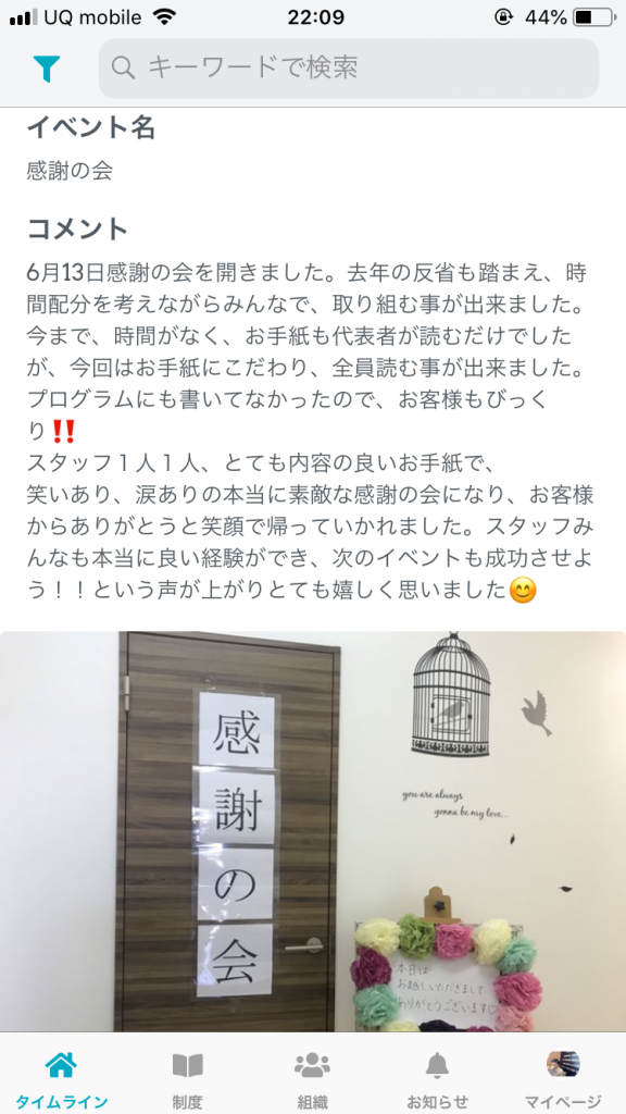 下の写真のようにTUNAGを通じて感謝の想いを伝えたり、嬉しかったことを投稿したりして日々情報共有が活発にできています。