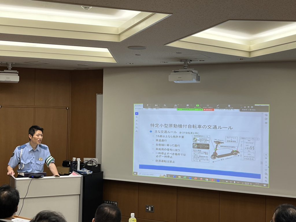 「講話」では、7月に規制緩和となった電動キックボードの交通ルール改正について、最近の交通事故の傾向や推移、「夏の交通事故防止運動」の重点項目の説明、特殊詐欺の被害防止などを講話いただきました。