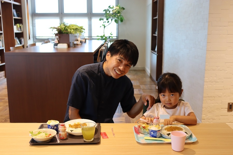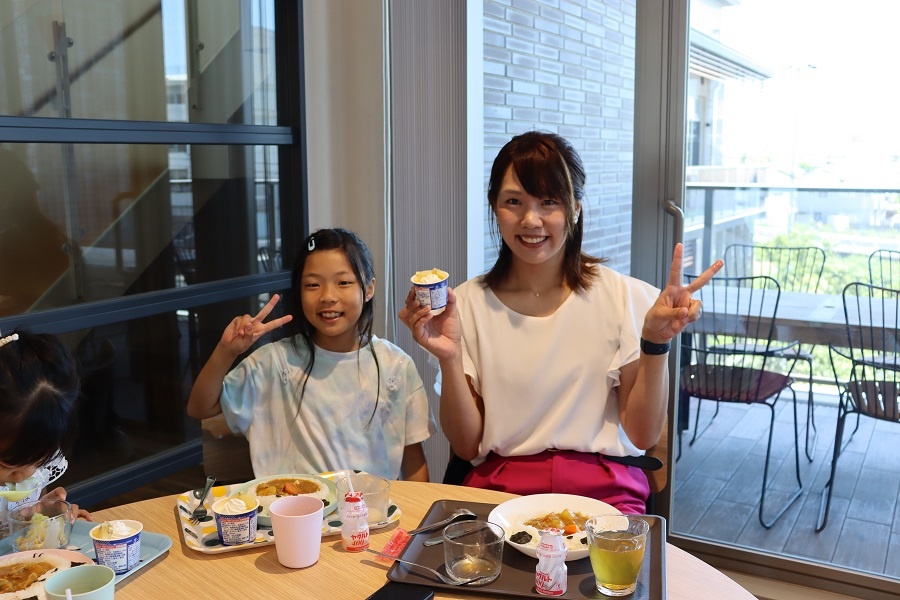 兵庫ヤクルトの社員食堂「Minori café」で、親子でゆっくりお話をしながらお食事していただきました。おかわりもたくさんしていただきました。