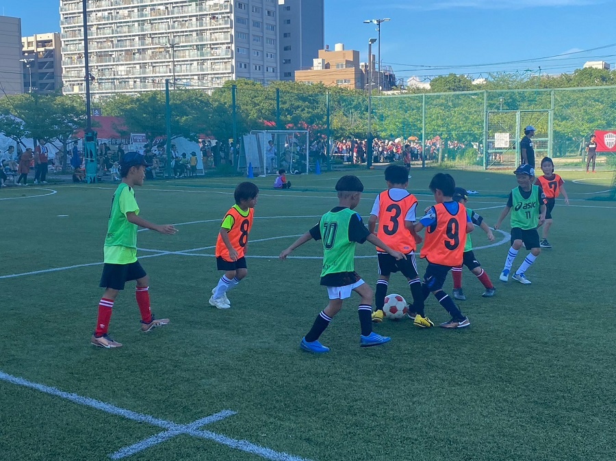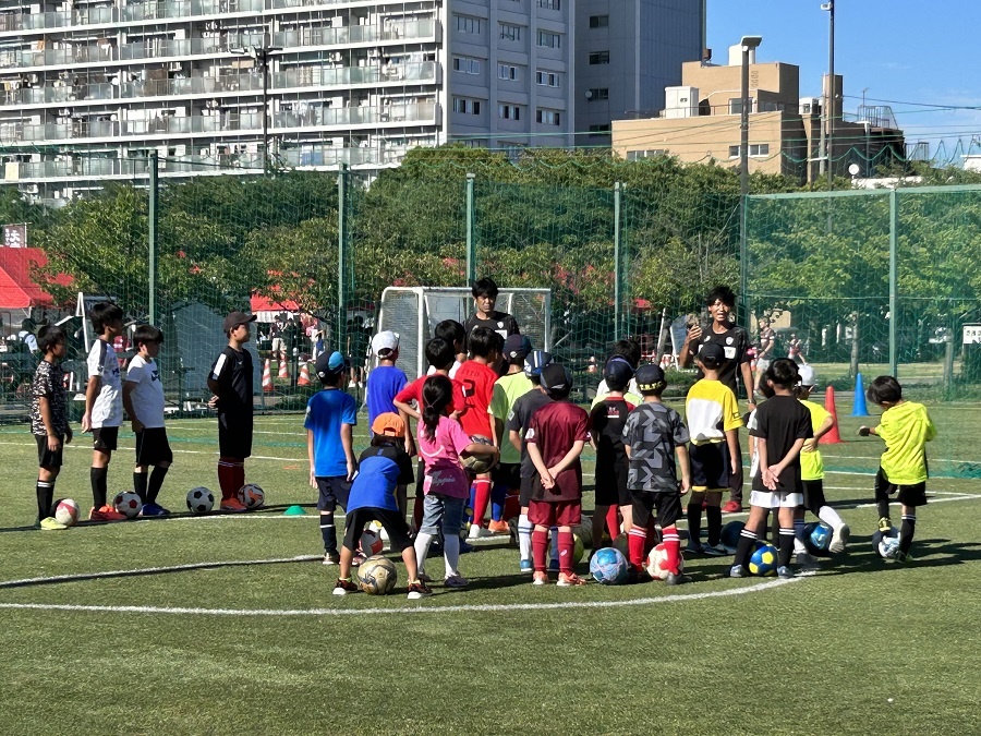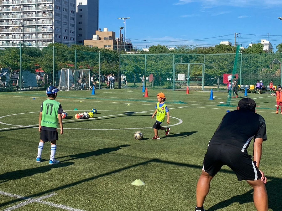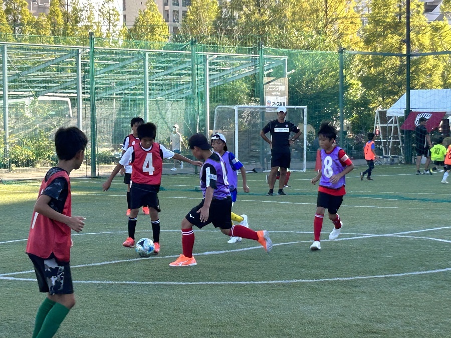ドリブル、パス、シュートまで、基礎的な技術もわかりやすくご指導いただきました。ドリブルが苦手だったお子さまもあっという間に上達し、終盤にはミニゲームが行われました。