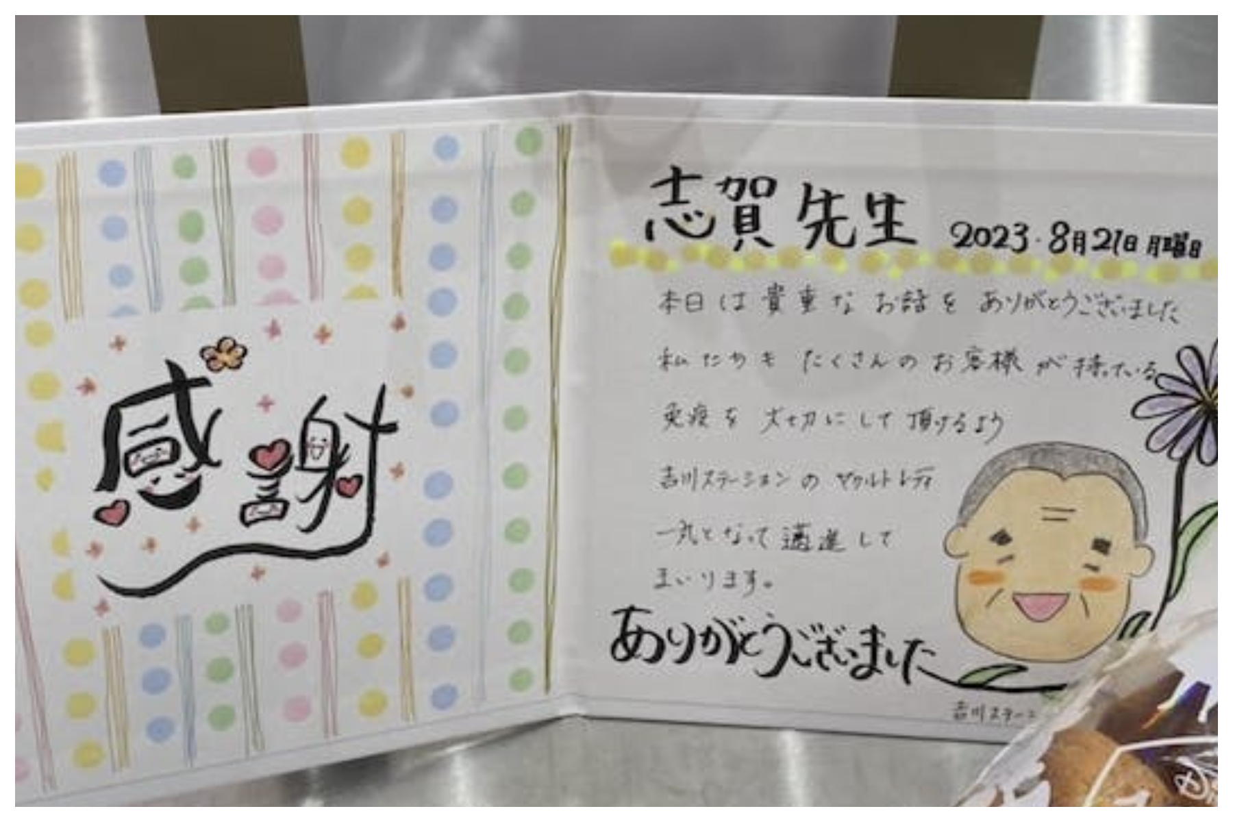 吉川町では、吉川総合公園内の研修館にて、開催いたしました。講演後、お客さまと一緒に受講したヤクルトレディより先生への感謝の想いを込めたメッセージカードをお渡しいたしました。