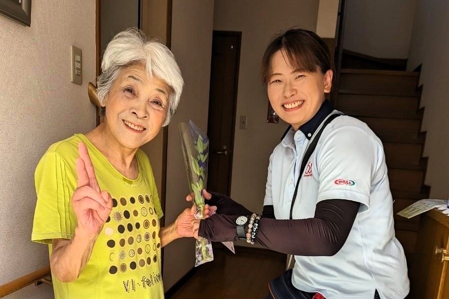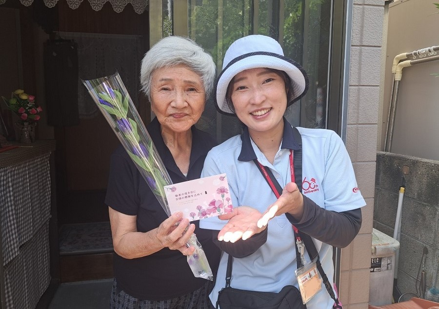 兵庫ヤクルトでは、9月8日~14日の期間、兵庫ヤクルト販売エリア※にお住まいの75歳以上の一人暮らしのお客さま約4900名に、敬老の日のお祝いと長寿の願いを込めて、りんどうの花とメッセージカードをお届けしました。※兵庫ヤクルト販売エリア…おもに神戸市の一部、東播磨、北播磨地域内で販売活動を行う。