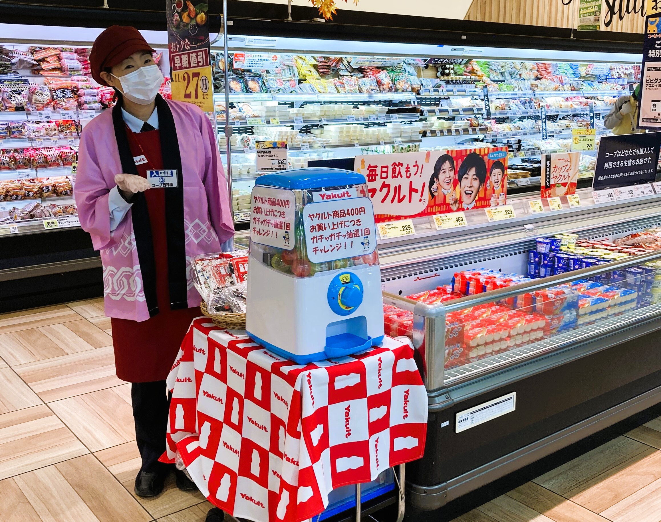 コープのマスコットキャラクターのコースケくんとヤクルトマンのコラボも実現し、記念撮影会を行いました。