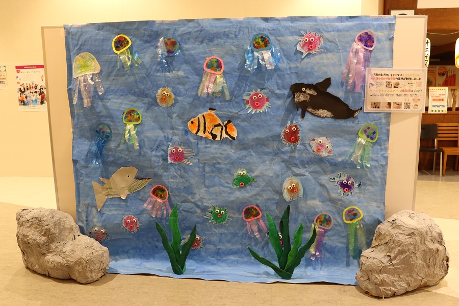 飲食店前の展示ブースでは、ヤクルトキッズスクール大久保ひまわり保育園の園児たちが「海の生き物」をテーマに制作したものを展示しています。あわせて、ヤクルトグループにおける食育事業、リサイクルへの取り組みも紹介しています。(展示期間:4月15日(月)まで)