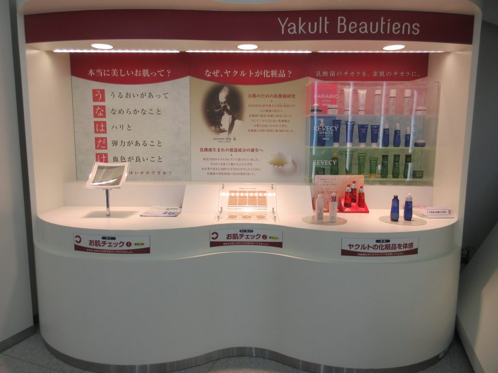 キッズコーナーではヤクルトスワローズ選手の等身大パネル、サイン入りバットやグローブなどが飾られています。化粧品コーナーではお試し化粧品がズラリ!!ラクトデュウやパラビオなど手付け体験ができます。