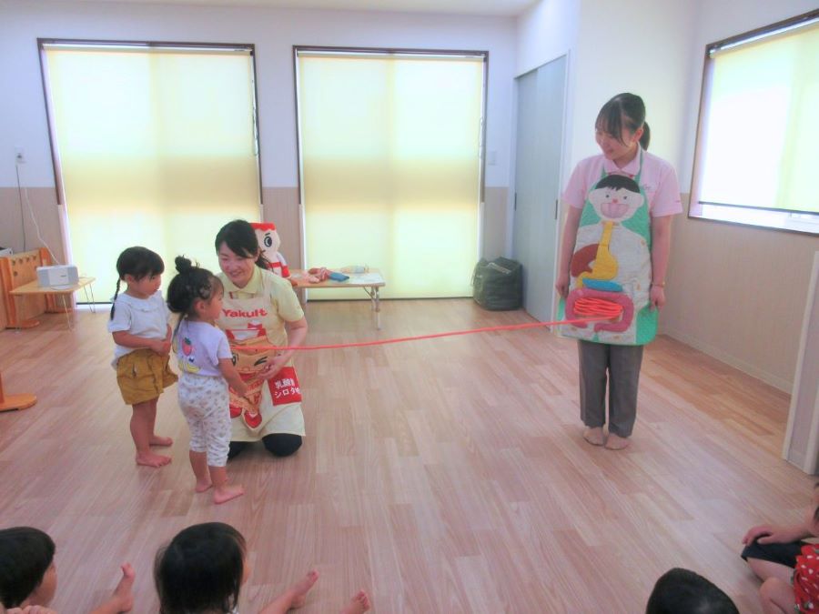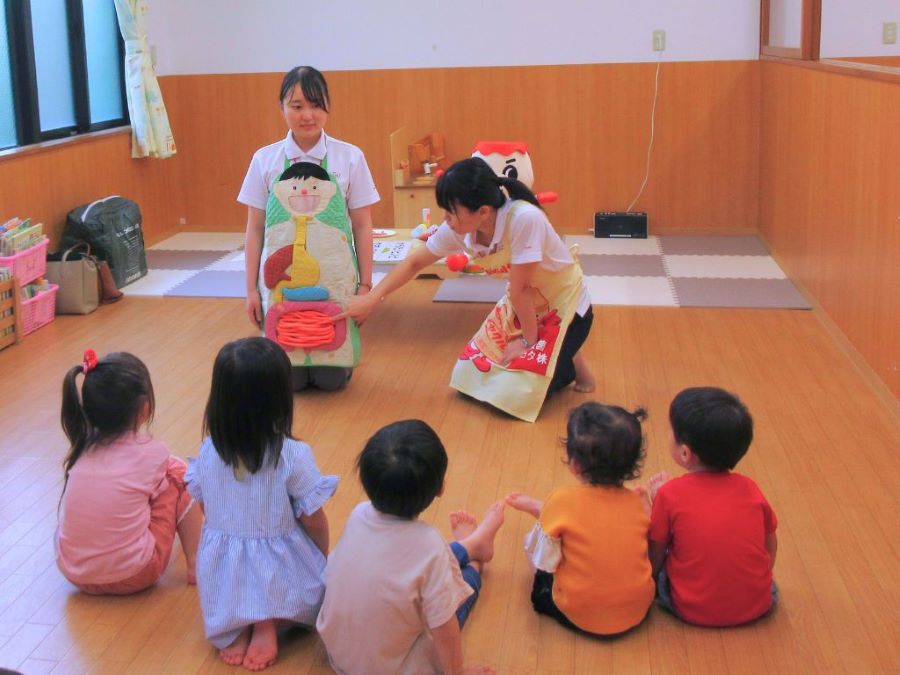 食べ物カードを食べさせたり、小腸模型を伸ばしたりする体験をとおして、おなかについて興味を持ってもらい、最後には「おなか元気の4つのお約束」もお話ししました。