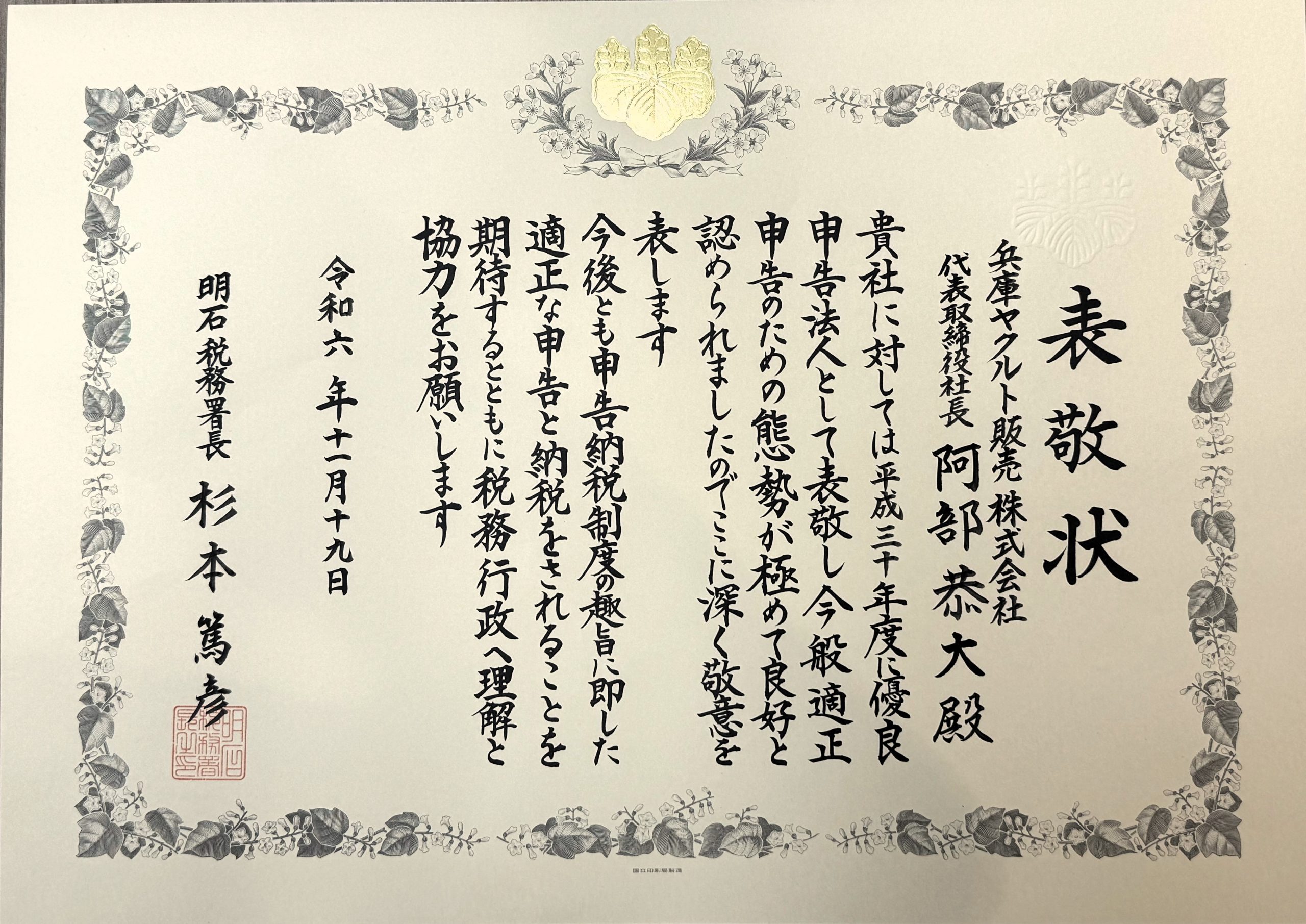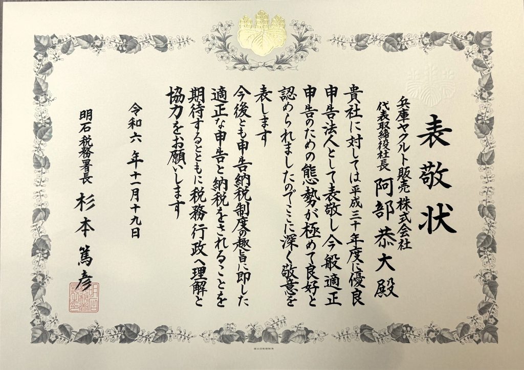 11月19日、明石税務署より、長年にわたる適正な税務処理と納税に対する感謝と敬意を込めて、優良申告法人として表敬状を授与いただきました。