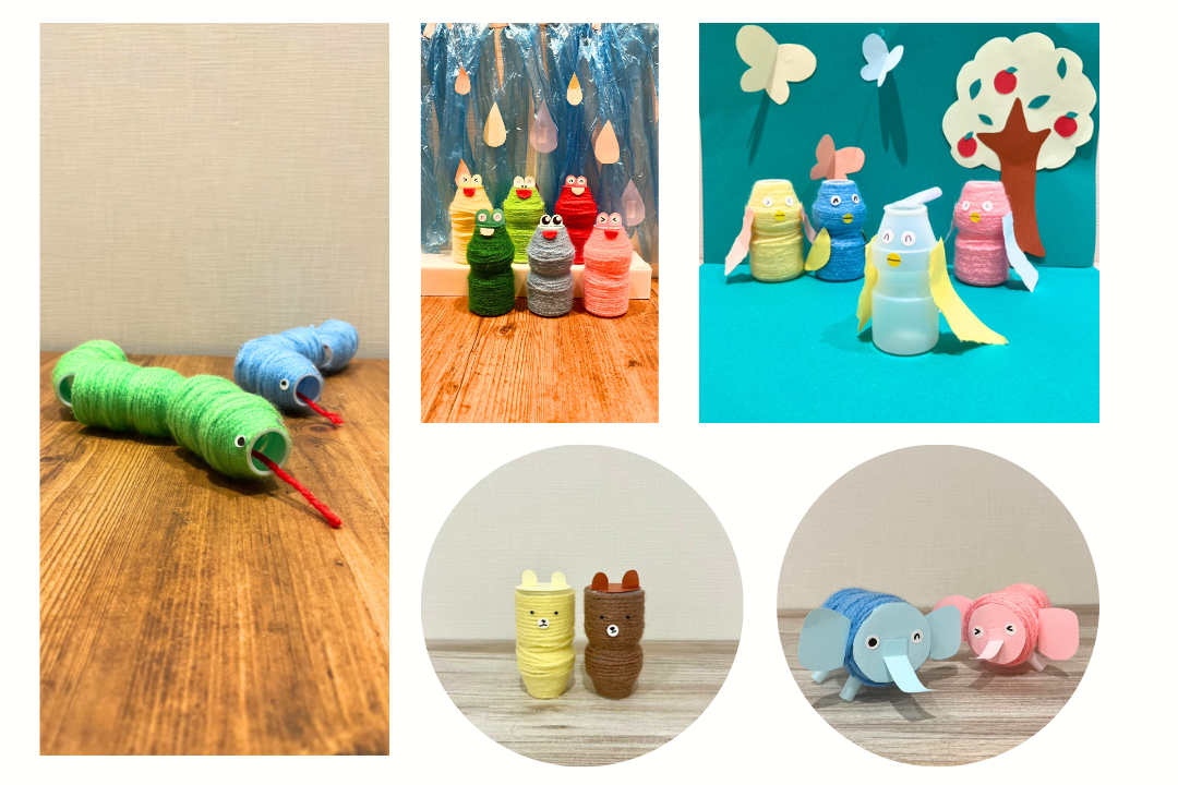 毛糸を空容器にくるくる巻き付けて、くまやへびが完成!いろんな動物を作ってみるのも楽しいですよ♪