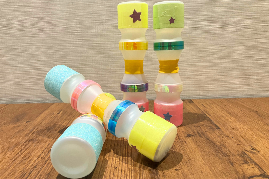 空容器の中に小豆や大豆を入れて、かわいいテープで止めたら手作りマラカスの完成!