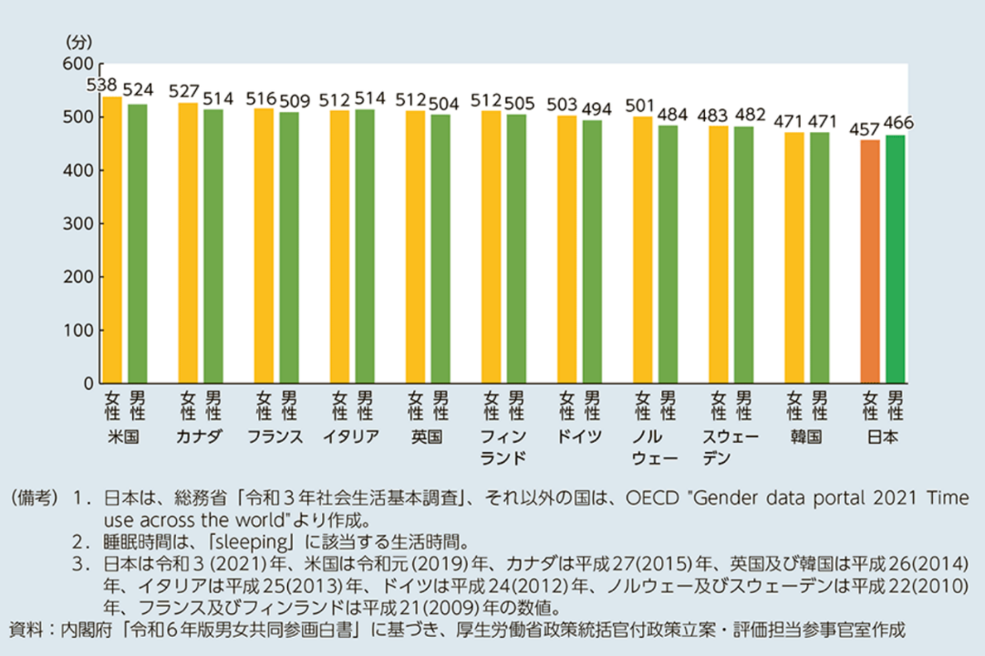 経済協力開発機構(OECD)が実施した調査によると、日本人の平均睡眠時間は調査対象国の中でも最も短く、最も睡眠時間の長いアメリカと比較すると、女性では1時間21分の差があります。