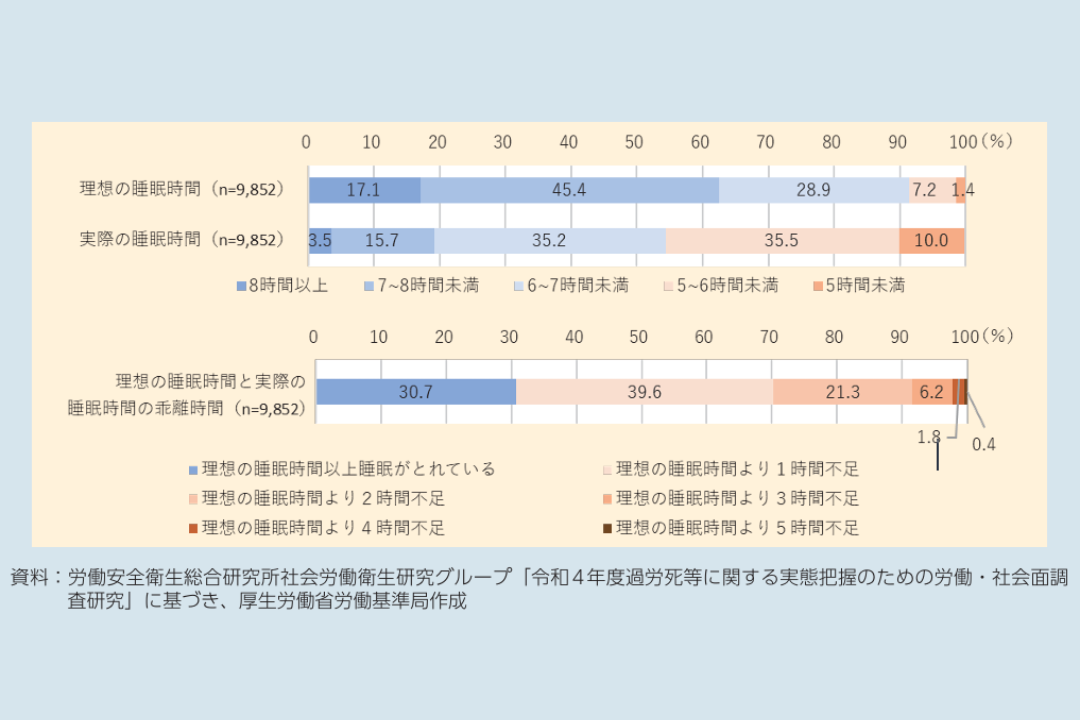 また、厚生労働省が実施した就業者を対象とする調査によると、理想の睡眠時間は「7~8時間未満」と答えた人が45.4%で最も多い一方、実際の睡眠時間は「5~6時間未満」が35.5%で最多でした。下のグラフからも就業者の約7割が理想の睡眠時間を確保できていないことが分かります。