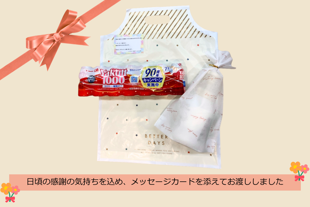 この取り組みは、地域の高齢者の方々の安心・安全な暮らしを支える皆さまへの慰労と、日々のご尽力への感謝の気持ちをお伝えするために行ったものです。