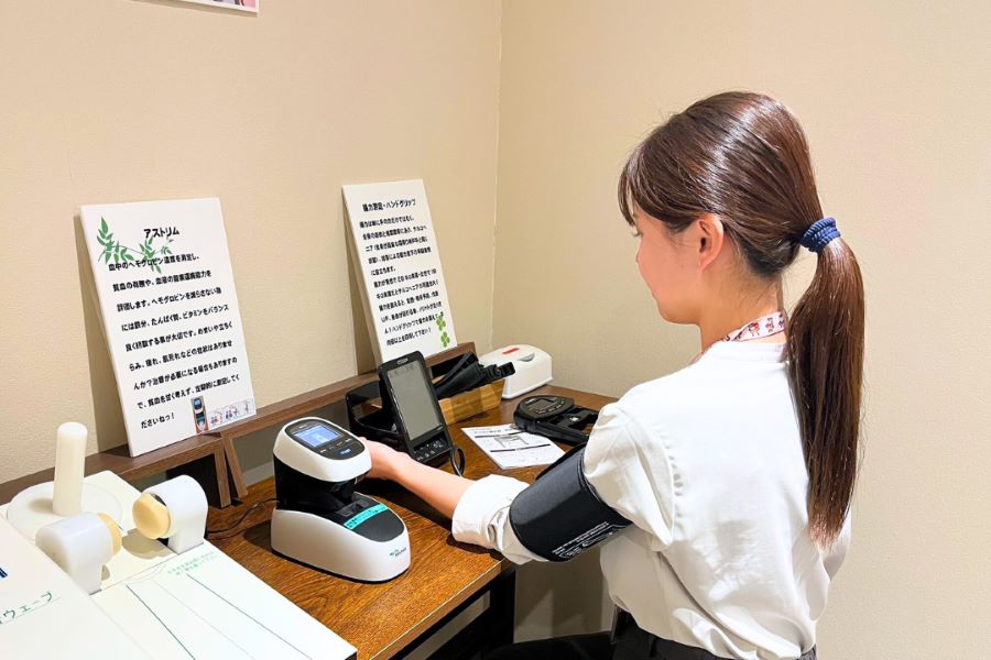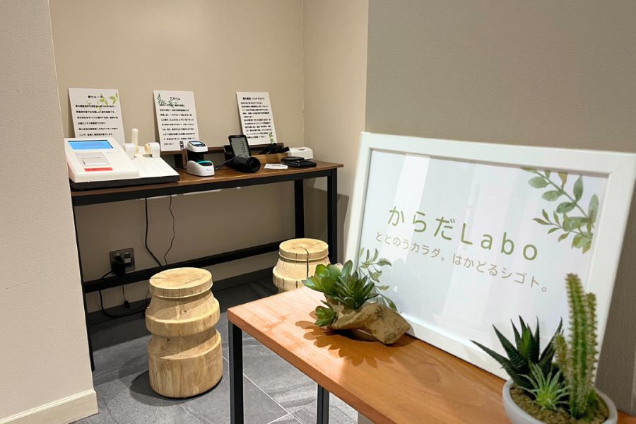 「からだLabo」には、骨健康度やヘモグロビン推定値の測定器、血圧計、ストレッチボードなどを常設しています。これらは自社で所有する機器を活用したもので、従事者が業務の合間に気軽に立ち寄り、セルフチェックを行える環境を整えています。単なる測定場所にとどまらず、心身のリフレッシュを図りながら自身の健康への関心を高める機会となっています。