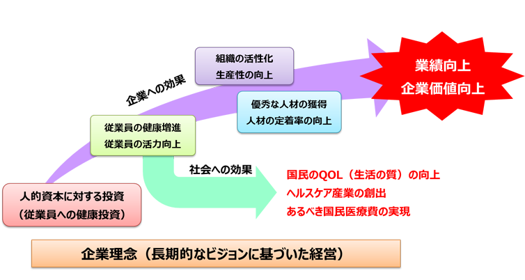 企業さま等における「健康経営」の推進、働く人々の健康づくりは、医療経費の節減のみならず、生産性の向上や、従業員の創造性の向上、企業イメージの向上、それによる優秀な人材採用の促進等の効果が得られるといった多くのメリットが考えられます。