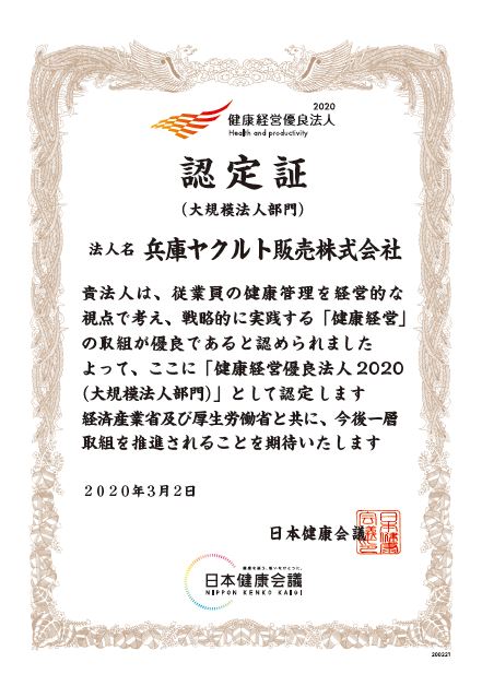 この度、兵庫ヤクルト販売株式会社は経済産業省が行っている『2020年度健康経営優良法人』の大規模法人部門において日本健康会議から認定されましたのでご報告致します。