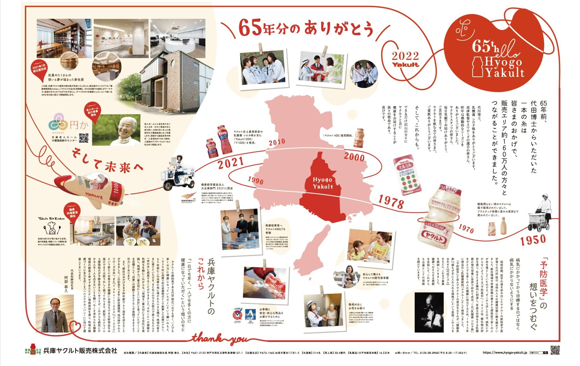 創立65周年を迎える事ができた感謝と新社屋の建設を記念し「65年分のありがとう」というテーマで神戸新聞に掲載しました。創業当時から現在、そして未来へとつながっていくことを一本の赤い糸でイメージしています。「健康お役立ちおもてなし企業」として、担当する地域の皆さまへの感謝の気持ちと、「一日でも早く、一人でも多くの方に健康になっていただく」という願い、そしてこれからも地域の健康づくりに全力を尽くすという想いを表現しました。