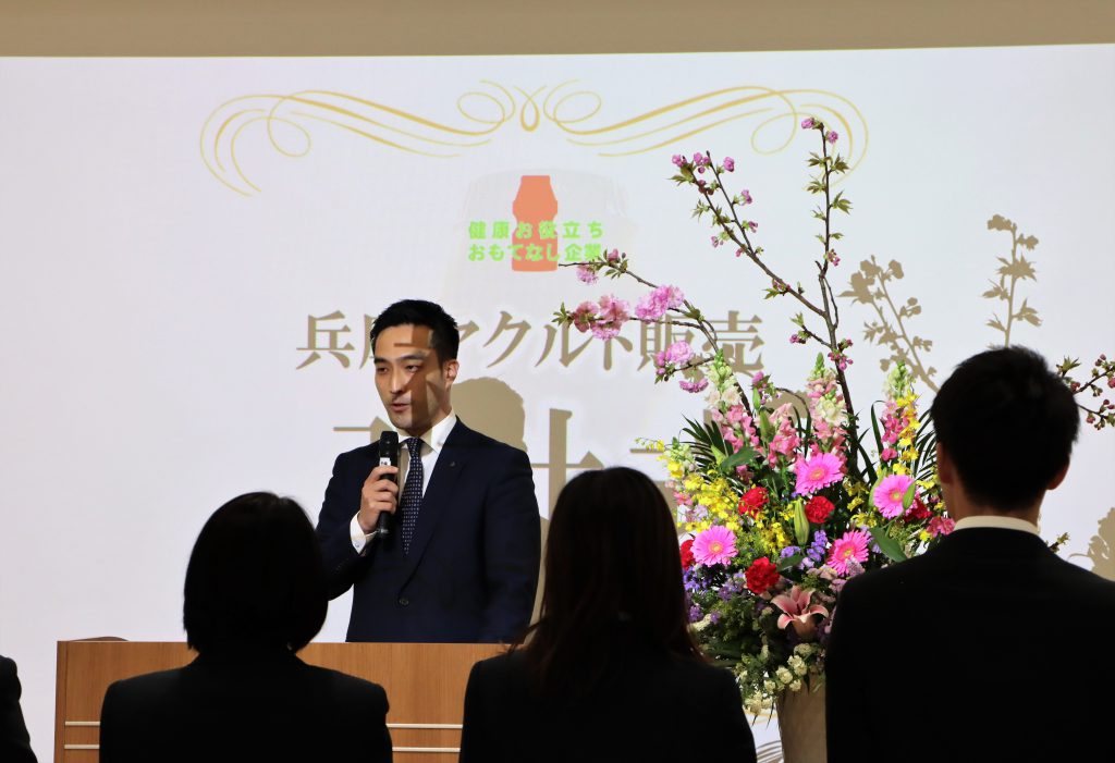入社式では、代表取締役社長 阿部が、兵庫ヤクルト流の祝辞、「”おめでとう“ではなく、”ありがとう“」の言葉とともに、同じ志を持ち、数ある企業の中から兵庫ヤクルトを選んで入社いただいたことへ改めて感謝の想いを伝えました。また、新入社員の皆さんへ、「変化と失敗を恐れない」、「1人で抱え込まない」、「初心を忘れない」の3つの事をお願いしたいと述べ、入社された皆さんの活躍に期待を寄せました。