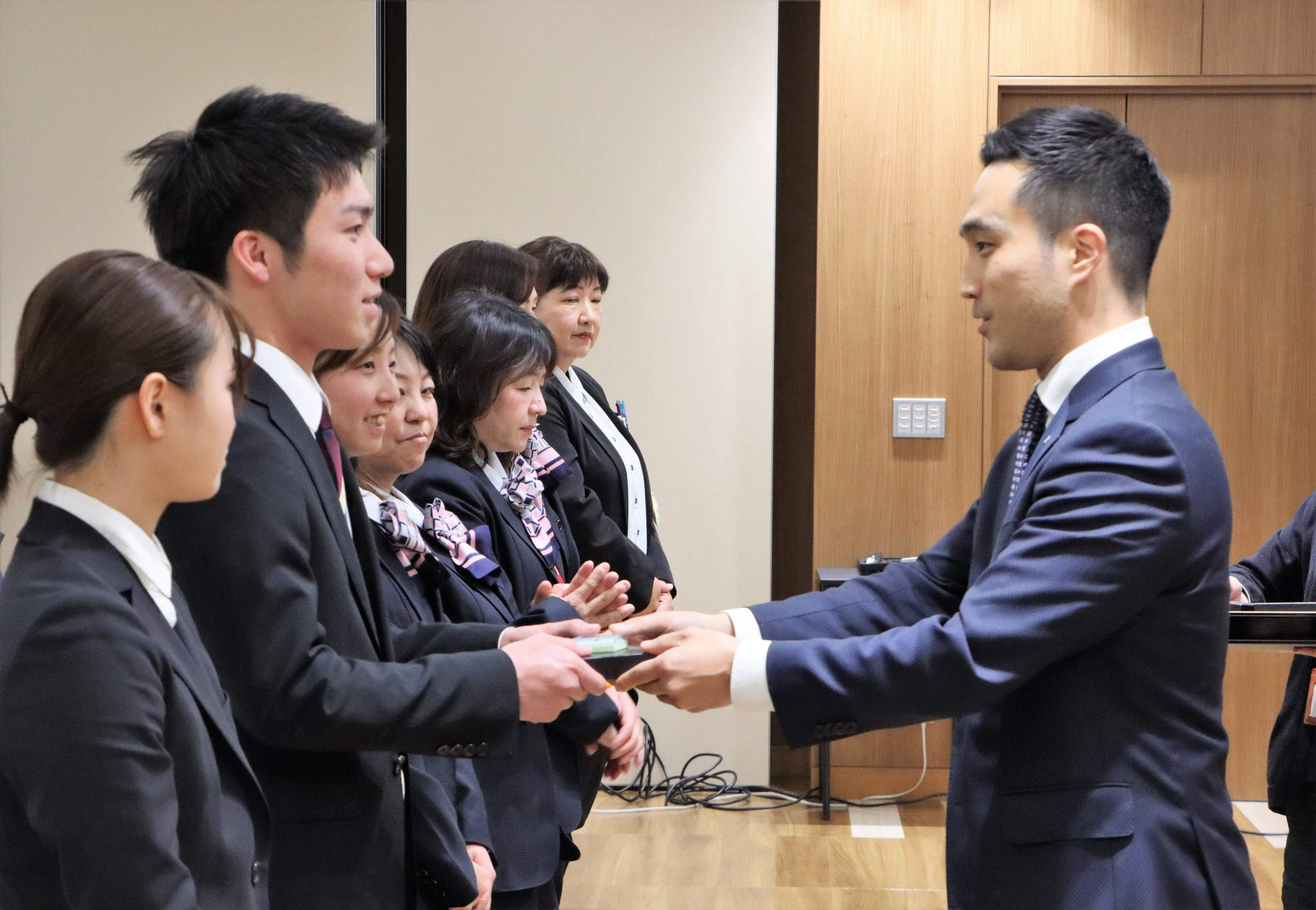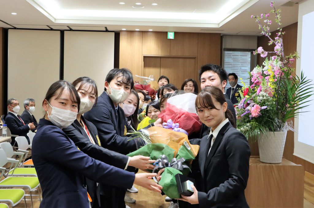 社長が1人1人に声をかけながら社章・エンブレムを手渡す姿に、新たな仲間を迎える喜びと感謝の想いを感じました。最後に、先輩社員から歓迎の意を表し、花束を贈呈しました。