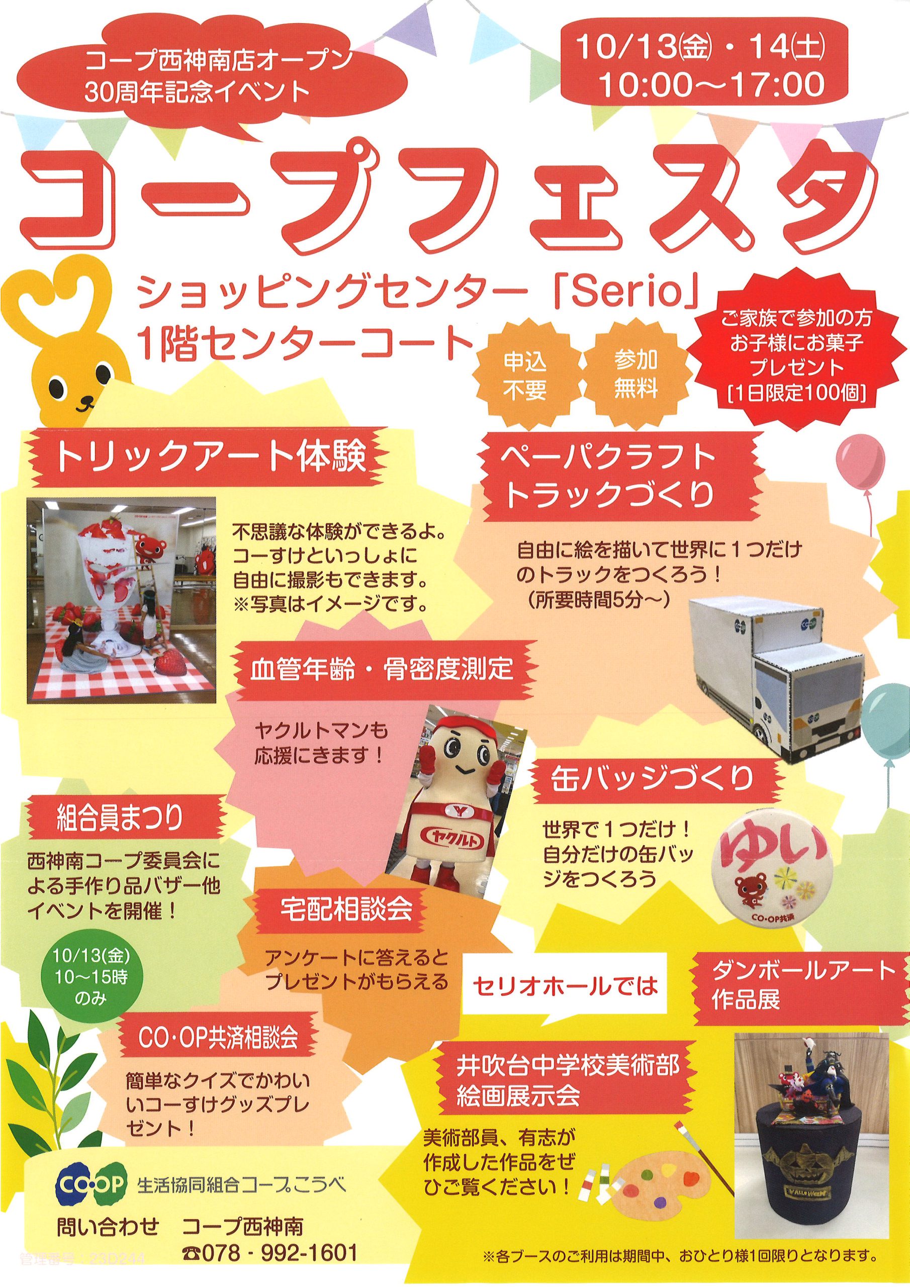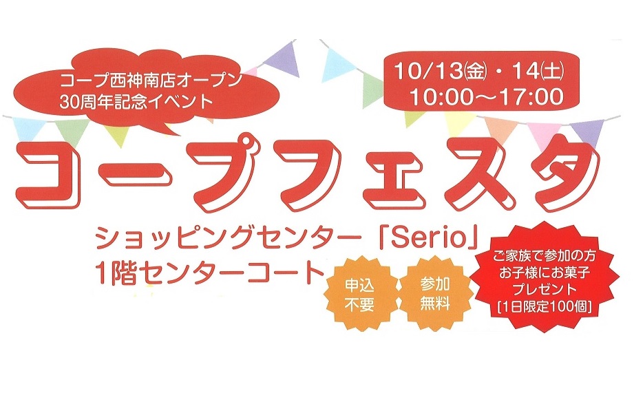 10月13日(金)・14日(土)、神戸市西区にあるショッピングセンター「Serio」にて、コープ西神南店の30周年記念イベント「コープフェスタ」が開催されます。兵庫ヤクルトも協賛させていただき、「ヤクルト健康測定会」として、血管年齢や骨健康度の無料測定会を行います。ヤクルトマンも応援にやってきます♪コープフェスタでは、お買い物の合間に楽しんでいただけるプログラムが多数ご用意されています。皆さまぜひ遊びにお越しくださいませ。
