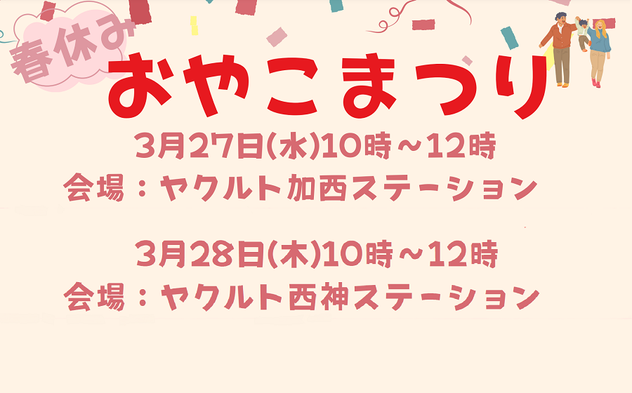 兵庫ヤクルトは、地域の子育て世帯に向けて、春休み中の親子で楽しめる無料イベント「春休みおやこまつり」を3月27日(水)に加西市、28日(木)に神戸市西区の2会場で開催いたします。