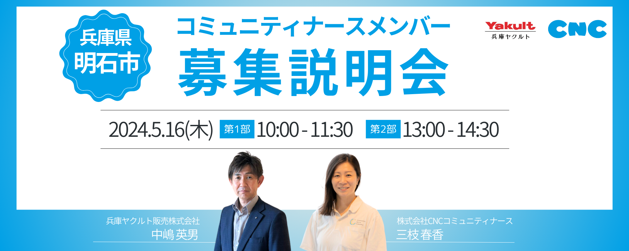 説明会では、統括マネージャーである中嶋英男、島根県雲南市を中心にコミュニティナースの実践を進める株式会社CNCの三枝春香が登壇し、明石市で描く未来、これからの事業のあり方、そして迎えていきたい仲間について説明します。