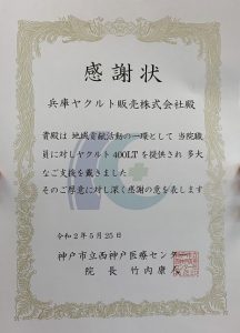 そこで、この度、神戸市立西神戸医療センターの皆さまへ感謝の気持ちを込めて、ヤクルト400LTを寄贈いたしました。西神戸医療センターでは、私どもの皆さまに感謝のエールをお送りしたいとの申し出を快く受け入れてくださり、私どもの想いに対し、ご丁寧に感謝状をご用意くださいました。ありがとうございます。