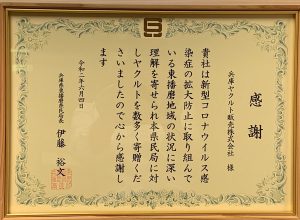 新型コロナウイルス感染症拡大防止にご尽力下さっている東播磨県民局(加古川保健所)の皆さまに感謝の気持ちを込めてヤクルト400LTを寄贈したことに対し、東播磨県民局長さまが感謝状をご準備下さいました。