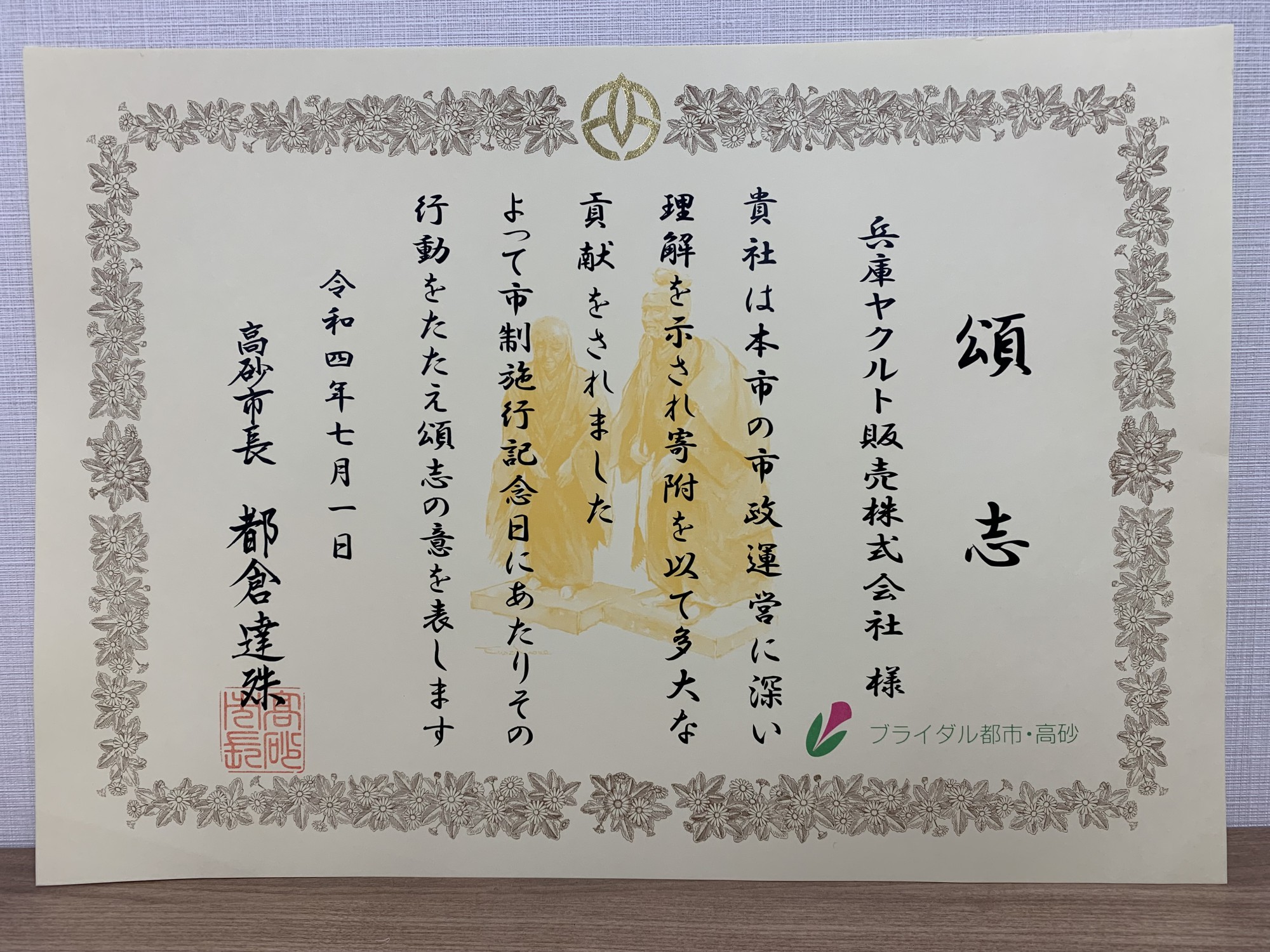 市民の健康を守る為にご尽力いただいた医療従事者の皆さまへ弊社から感謝の意を表した寄贈に対し、高砂市よりこのような表彰を頂きましたこと大変光栄に存じます。今後も地域の健康に貢献する企業として活動を続けてまいります。
