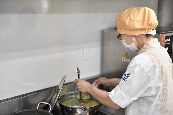 給食調理設備で、毎日手作りで給食を提供しています。旬の野菜・果物・魚をとり入れた季節感あふれる給食をご提供しています。また、アレルギー食にも対応しており安心して頂けます。