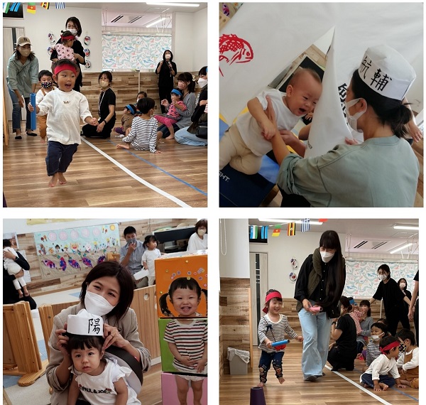 🐣組はお寿司になっての親子競技、🐰組はソーラン節からの組体操! みーんな頑張りました!