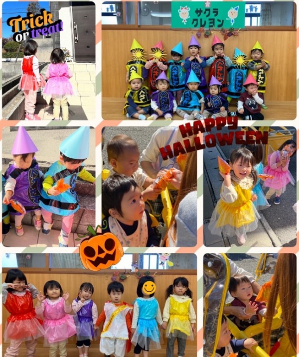 先日のハロウィンではひよこ組はクレヨン、うさぎ組はお姫様と王子様に仮装しました。『トリックオアトリート🎃』可愛い子ども達はお菓子をもらい大喜び🍭