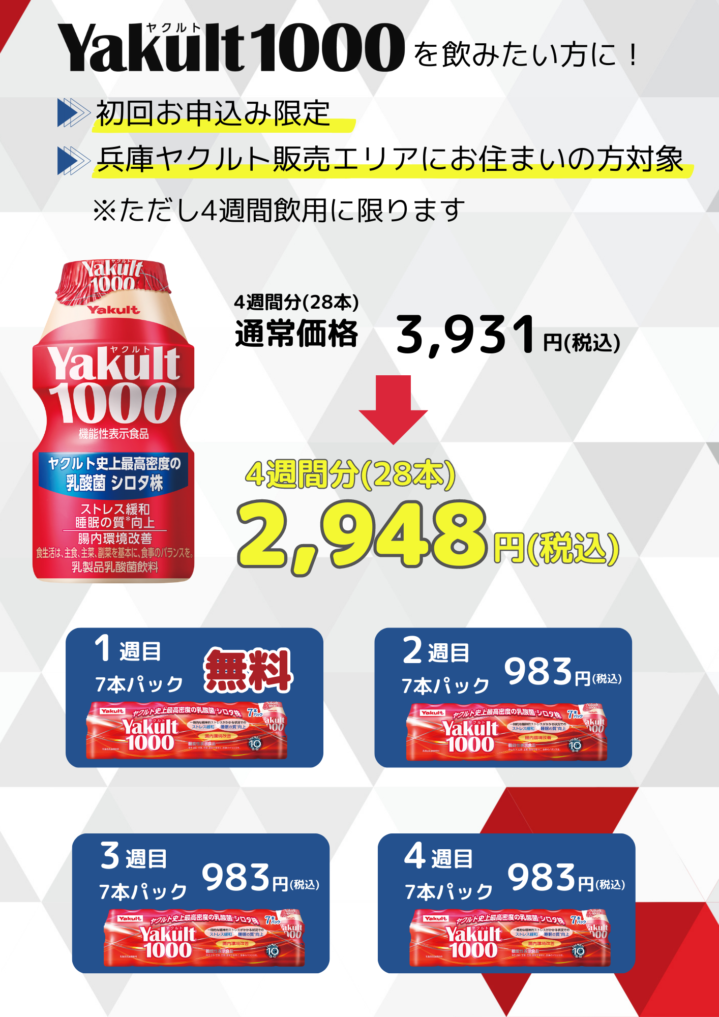 ※このキャンペーンは兵庫ヤクルト販売の管轄エリアで、 初めてヤクルトをお飲みになる方のみキャンペーンとさせていただいております。 エリアの確認はコチラからご確認ください。