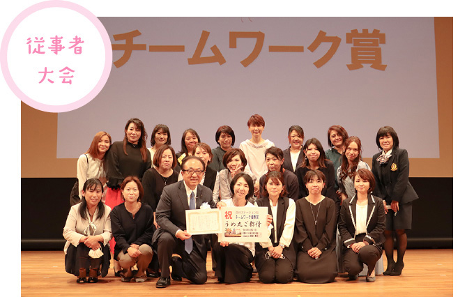 ヤクルトレディの年間表彰式典です。個人表彰とステーション表彰があり、1年間の頑張りをみんなで称えます。目指す目標ができモチベーションアップにもつながります。